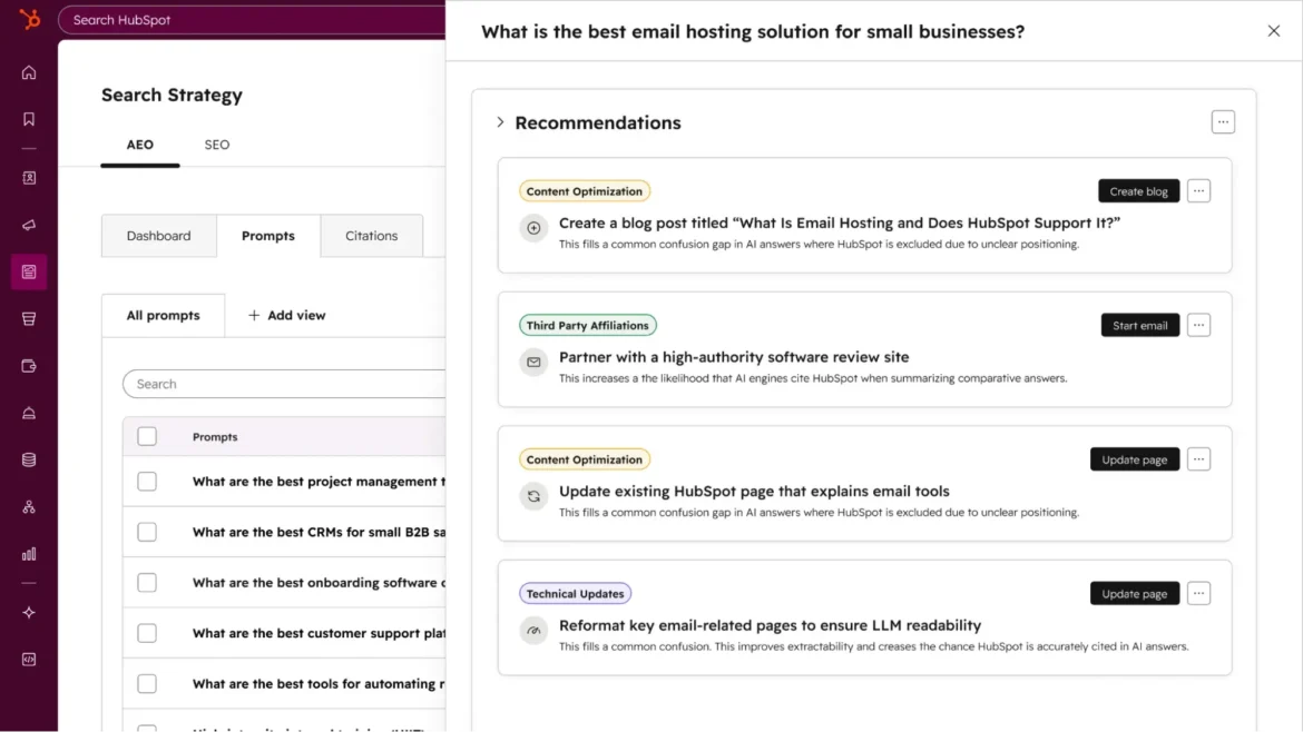 Pro tip: Track AI-influenced form fills and deal creation inside HubSpot CRM to understand how generative search contributes to the pipeline, even when attribution isn’t linear. Use HubSpot AEO’s Recommendations feature to prioritize which visibility gaps to close first. Each recommendation includes a full content brief tied to the bottom-of-funnel prompts most likely to drive AI-referred leads.
