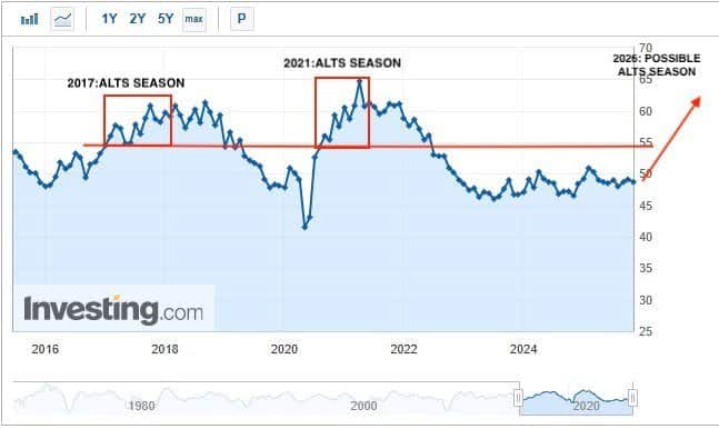 • To μεγάλο altseason του 2017 εμφανίστηκε όταν ο ISM είχε ξεπεράσει το 55–60, δείχνοντας δυνατή οικονομική δραστηριότητα.