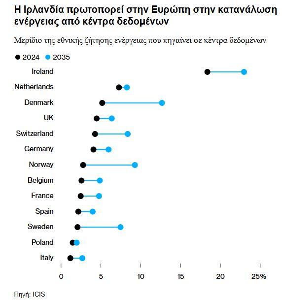 ‘Ετοιμη να εγκρίνει πολιτικές που επιτρέπουν στα κέντρα δεδομένων να χρησιμοποιούν ορυκτά καύσιμα για την τροφοδότηση των λειτουργιών τους δηλώνει η Ιρλανδία σε μια εντυπωσιακή ανατροπή της πολιτικής της, η οποία υπογραμμίζει την ένταση μεταξύ της οικονομικής ανάπτυξης και των κλιματικών στόχων, όπως επισημαίνει το Bloomberg.