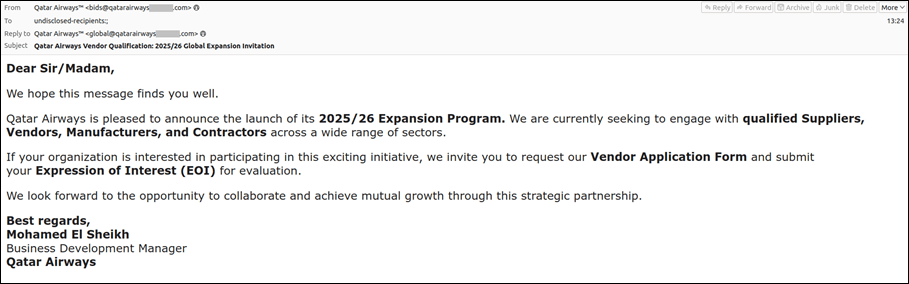 Τα εν λόγω παραπλανητικά emails εμφανίζονται ως επίσημη επικοινωνία από τα τμήματα προμηθειών διεθνών αεροπορικών εταιρειών, με στόχο να προσελκύσουν πιθανούς συνεργάτες ή προμηθευτές για ανύπαρκτα έργα. Μόλις ο παραλήπτης απαντήσει, οι κακόβουλοι χρήστες αποστέλλουν σειρά πλαστών εγγράφων, όπως φόρμες εγγραφής προμηθευτών και συμφωνητικά εμπιστευτικότητας (NDA), για να φανούν αξιόπιστοι. Οι επιχειρήσεις καλούνται επίσης να καταβάλουν ένα «Υποχρεωτικό Επιστρεπτέο Τέλος Εκδήλωσης Ενδιαφέροντος» (Mandatory Refundable Expression of Interest Deposit) ύψους αρκετών χιλιάδων δολαρίων, με το πρόσχημα ότι το ποσό αυτό θα «εξασφαλίσει μια θέση προτεραιότητας στο χρονοδιάγραμμα συνεργασίας» και θα επιστραφεί μόλις ολοκληρωθεί η «συνεργασία».