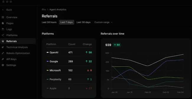 Here’s a screenshot showing what the monitoring analytics looks like. The screenshot shows a graph with referral traffic from AI systems in one place. SEO experts can use this graph to identify the AI agents working best for the business, and those with the greatest opportunity: