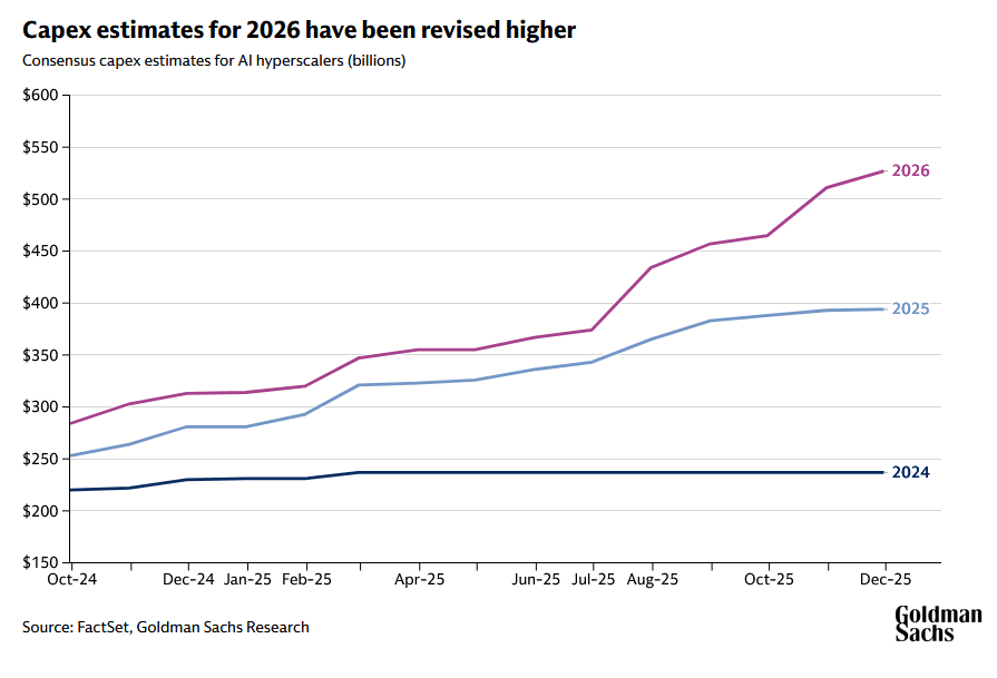 Μπορεί πολλοί να αμφιβάλουν για την ικανότητα του κλάδου της Τεχνητής Νοημοσύνης να διαχειριστεί συνετά τις μεγάλες επενδύσεις που απαιτούνται, αλλά η Goldman Sachs εκτιμά ότι τα κεφάλαια που θα διατεθούν το 2026 πιθανότατα θα φτάσουν τα 527 δισ. δολάρια.