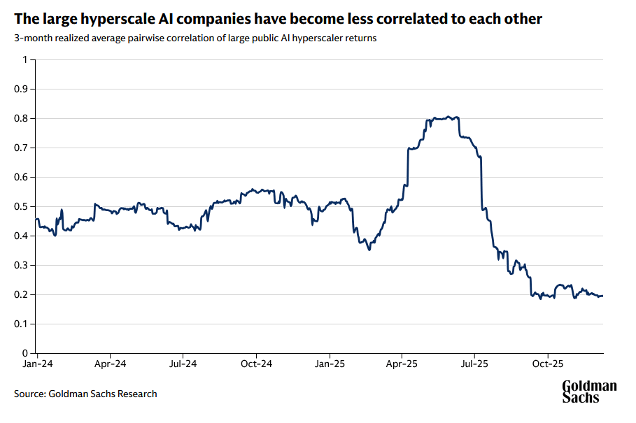 Για παράδειγμα, ενώ οι μεγαλύτερες μετοχές AI σημείωσαν άνοδο νωρίτερα φέτος, λόγω της σταθερότητας των επενδύσεων στην AI, από τον Ιούνιο η συσχέτιση των τιμών των μετοχών των μεγάλων εταιρειών AI έχει μειωθεί από το 80% στο 20%.