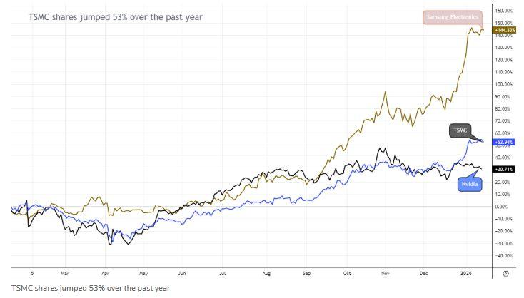 Οι μετοχές της TSMC που είναι εισηγμένες στο χρηματιστήριο της Ταϊπέι σημείωσαν άνοδο 44% πέρυσι, ξεπερνώντας την άνοδο 25,7% του ευρύτερου χρηματιστηρίου.
